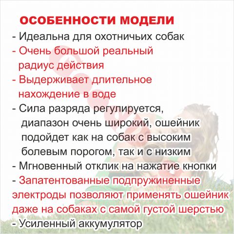 Самый большой реальный радиус действия и полная водонепроницаемость (ошейник выдерживает длительное нахождение в воде) позволяют использовать модель для дрессировки охотничьих собак.